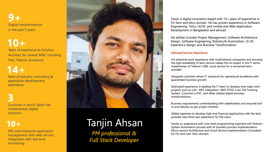 Additionally, in role as a technical architect, Tanjin has demonstrated exceptional expertise. Also Tanjin thoroughly assessed the client’s existing IT system and proposed an enhanced, scalable solution. By governing the implementation process, the team achieved remarkable results. Notably, his efforts led to a 40% efficiency increase and a 30% reduction in annual operational costs for a prominent stock exchange. Previously grappling with resource usage issues and potential deadlocks due to a lack of control over their multi-platform system, the organization expanded its hardware resources. His team’s ingenious solution—a micro-services architecture—provided fine-tuned resource control, ultimately resolving the deadlock issue and resulting in substantial cost savings.